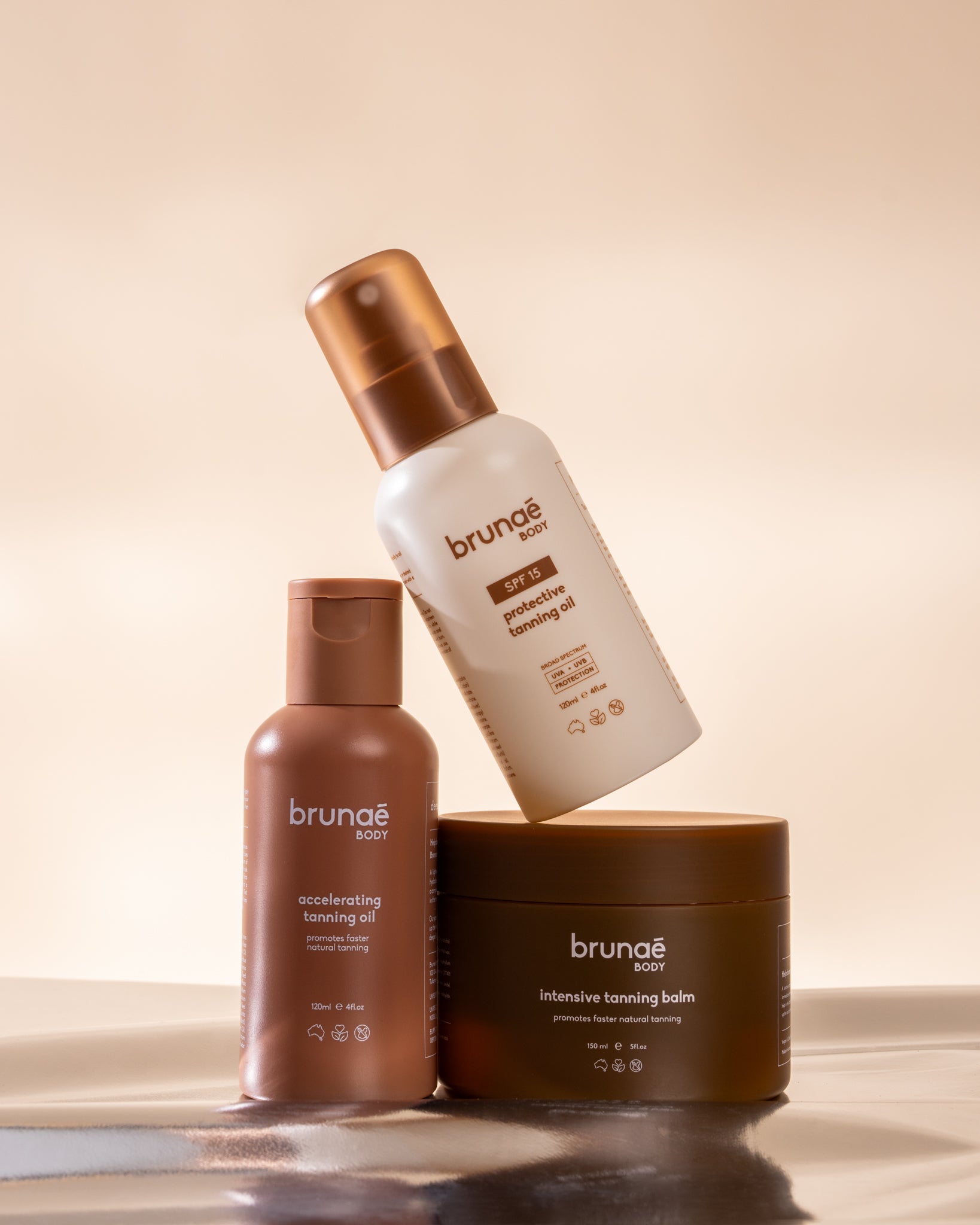 Brunae Body™ is your natural tanning shortcut. As the name suggests, The Complete Glow Bundle is the complete package for glowing skin. It combines preparation with the Maximum Moisturiser, Tanning with the Accelerating Tanning Oil/Intensive Tanning Balm and Hydration with the Hydrating Mist. Our best selling formula's work with ingredients that accelerate the tanning process, giving you dark tan with less time in the sun.